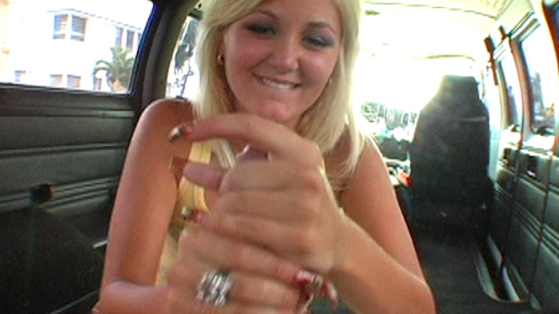 How you all doing? Bang Bus is on the road and this time we went over to downtown to see what is going on over there. This area of the greatest city of Miami wasn't truly discovered by our famous vehicle so we decided to fix it. It was a lot of people of all kind let me tell you. Businessmen and boms, hot college chicks and some weird dressed foreigners. We should come here more often. Anyway, after an hour of driving and talking with all this peeps I just told you about we ran into this hotties walking down the street. I asked them to join us on the adventure and they jumped in. Nice tits which were covered by expensive looking outfit made me think that those girls belong to the type easy going gold diggers who would do anything for money. I was right, one of them gave me a great hand job swearing that she have never done it before in front of the camera. We left them almost at the same spot where they were. Almost. After that its started raining and I thought we done for today, but right before I wanted to ask my driver to take me back we saw a lonely girl hiding from the rain. I invited her to the bus and she got on hook right away. You all know what usually happens after that. She was riding Julius cock like a cowgirl. The drop off was pretty cool. We promised to give her a tape. Poor thing really believed in that.